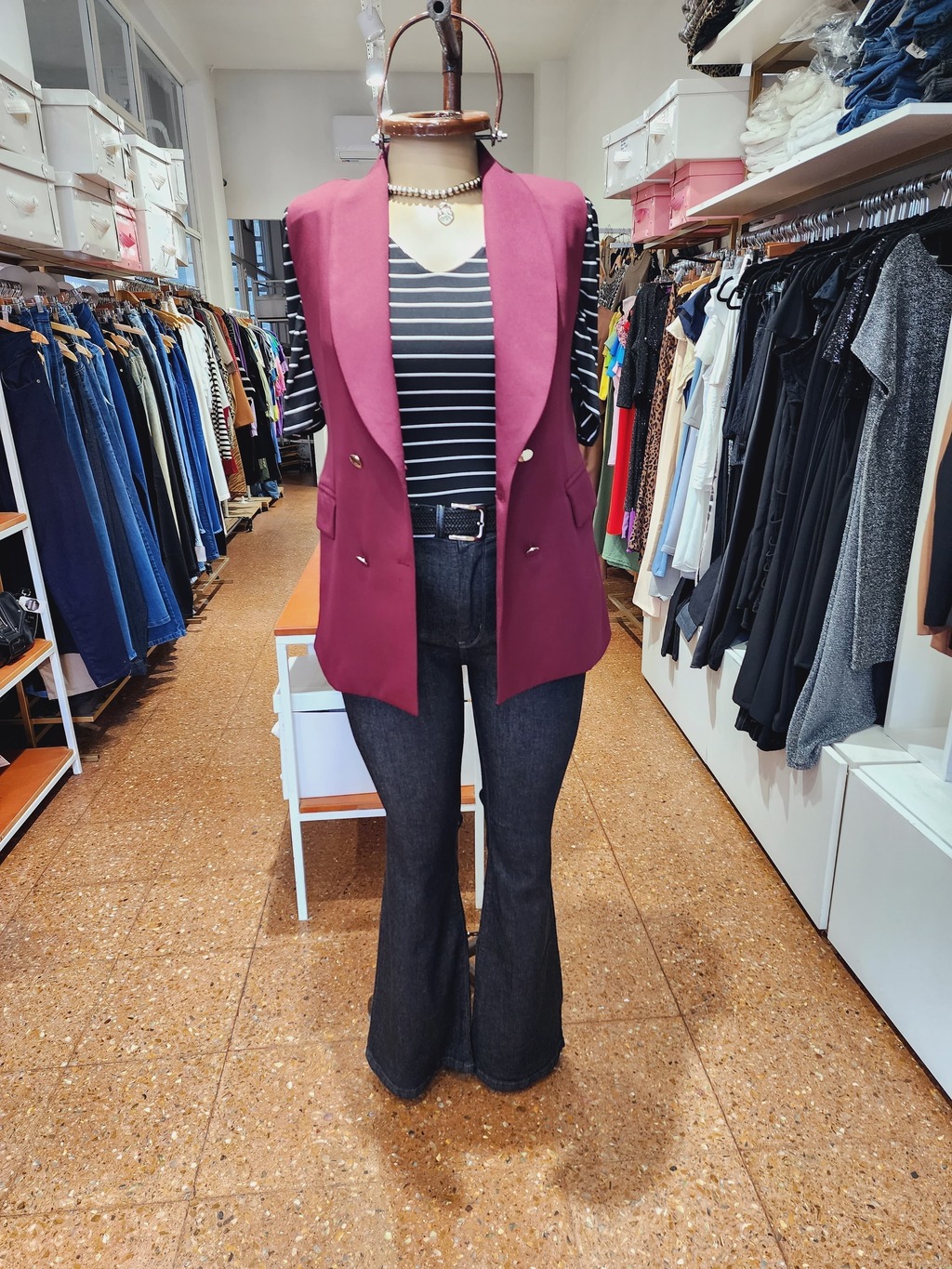 Chaleco sastrero cruzado. Con botones metalicos y solapa en los bolsillos. Tiene forreria y hombreras.